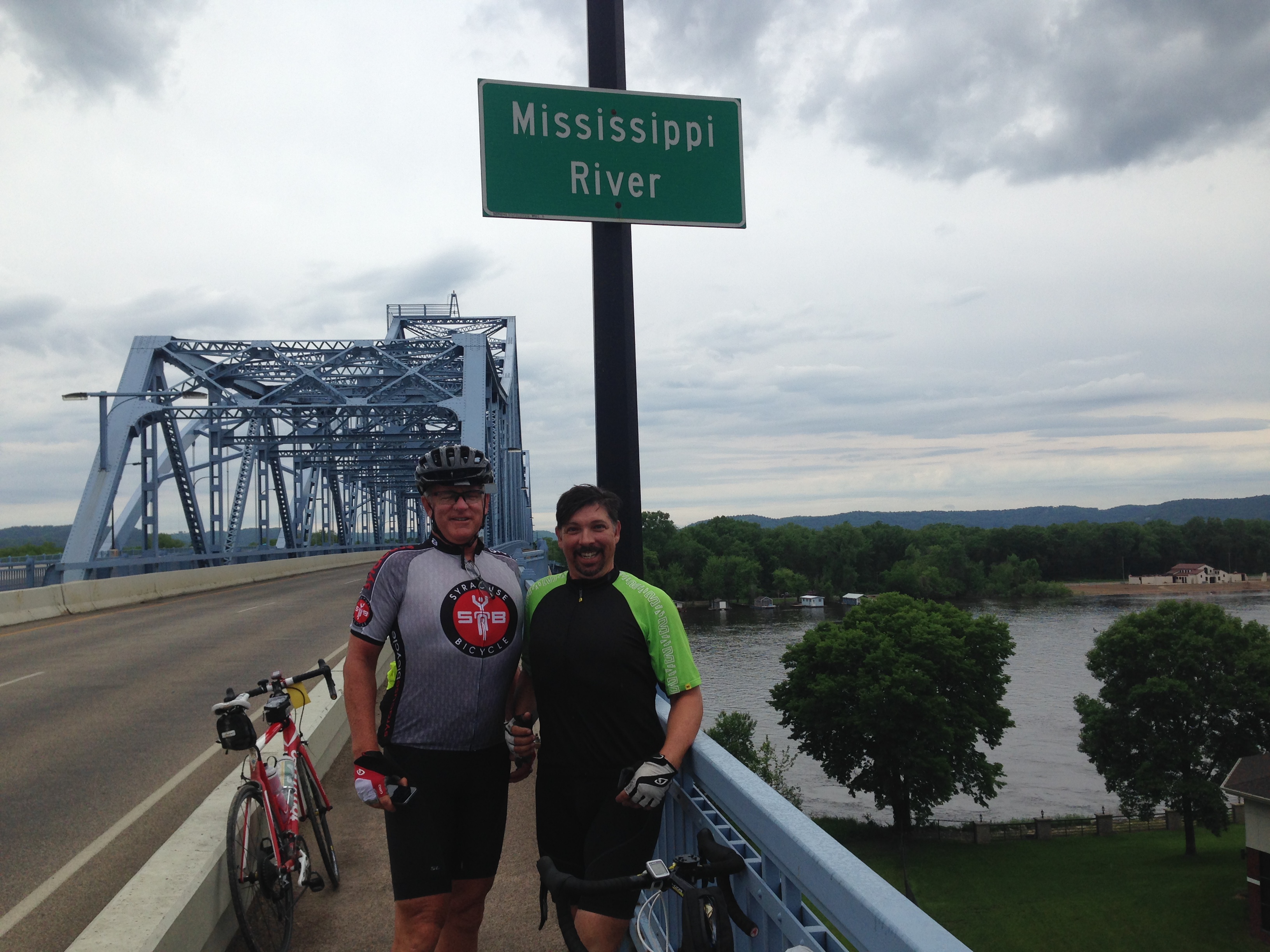 As we crossed the bridge and the Mississippi River at Lacrosse, we took a picture at the sign on the bridge. When we finished, Alan notice a group of people down below the bridge going to dinner. He shouted down to them…..something along the lines of “Yeh, we are glad to be at the mighty Mississippi on our bike ride across North America. We have journeyed 1300 miles to get here! They all clapped and cheered us on and Alan, all pumped up, added you can vote for me in the next election.” I guess he was excited to be there. 🙂 The Mississippi was a beautiful sight; actually a major milestone crossing on a bike.