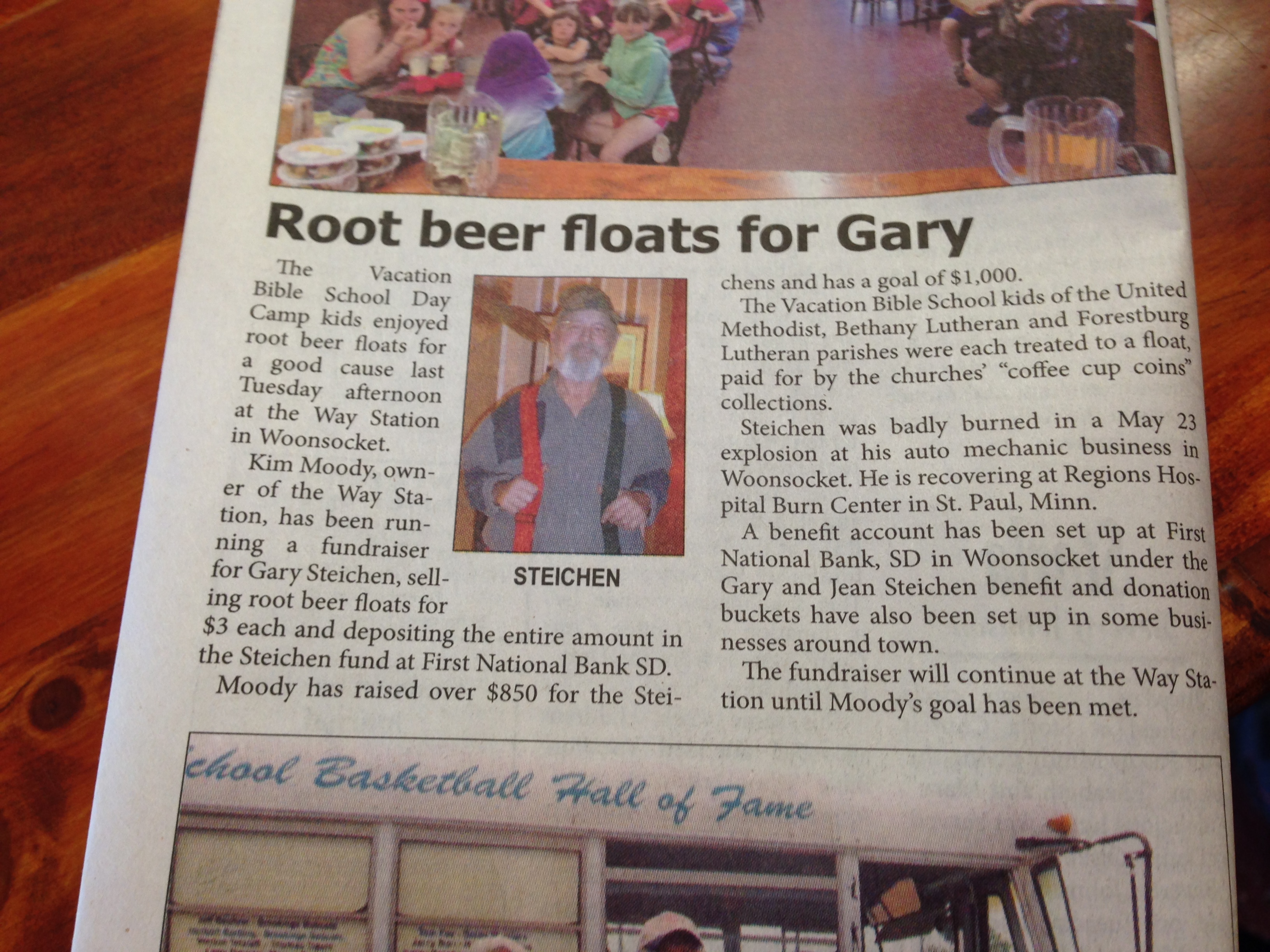Stories along the way: On Friday, we pedaled into Woonsocket about 9am or so in the morning and noticed an electronic billboard outside a quaint little café called the Way Station: “Root Beer floats for Gary for less than $10.” I had to turn around to take a video of the sign. When that happened one of the waitresses came out into the parking lot and noticed us and inquired: “Where are you guys riding to this morning?” We responded Seattle….and she laughed: “you are pulling my leg.” I then asked her what the float for Gary was about. She shared the story of a frequent customer named Gary Stechen who owns the auto mechanic shop across the street. He was in the café on May 23 to get something to eat then went back to his shop and was badly burned in an explosion and is being treated at a Burn Center in St Paul MN.