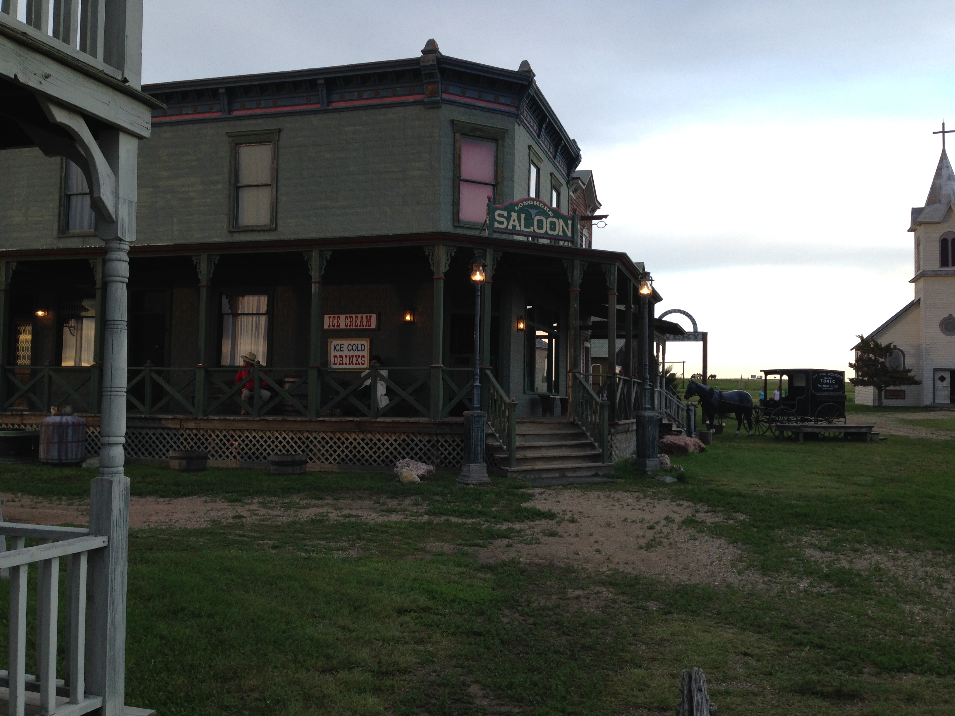 One thing seems certain in South Dakota: the wind keeps blowing! In fact, the wind can start out in the morning dead in your face at 12-25mph and turn almost clockwise by late afternoon. It has been slow going for a number of reasons with only about 185 miles of biking in the past three days. As of June 14th we had made it to Belvidere, South Dakota right near the Old Town 1880. This town is a conglomeration of buildings from all over the Dakota Territory brought in to capture the feeling of a homestead and old west town complete with church, blacksmith, saloons, horses and of all things a camel. Lisa and I decided to stroll the town on a another date night after spaghetti dinner with our gang.