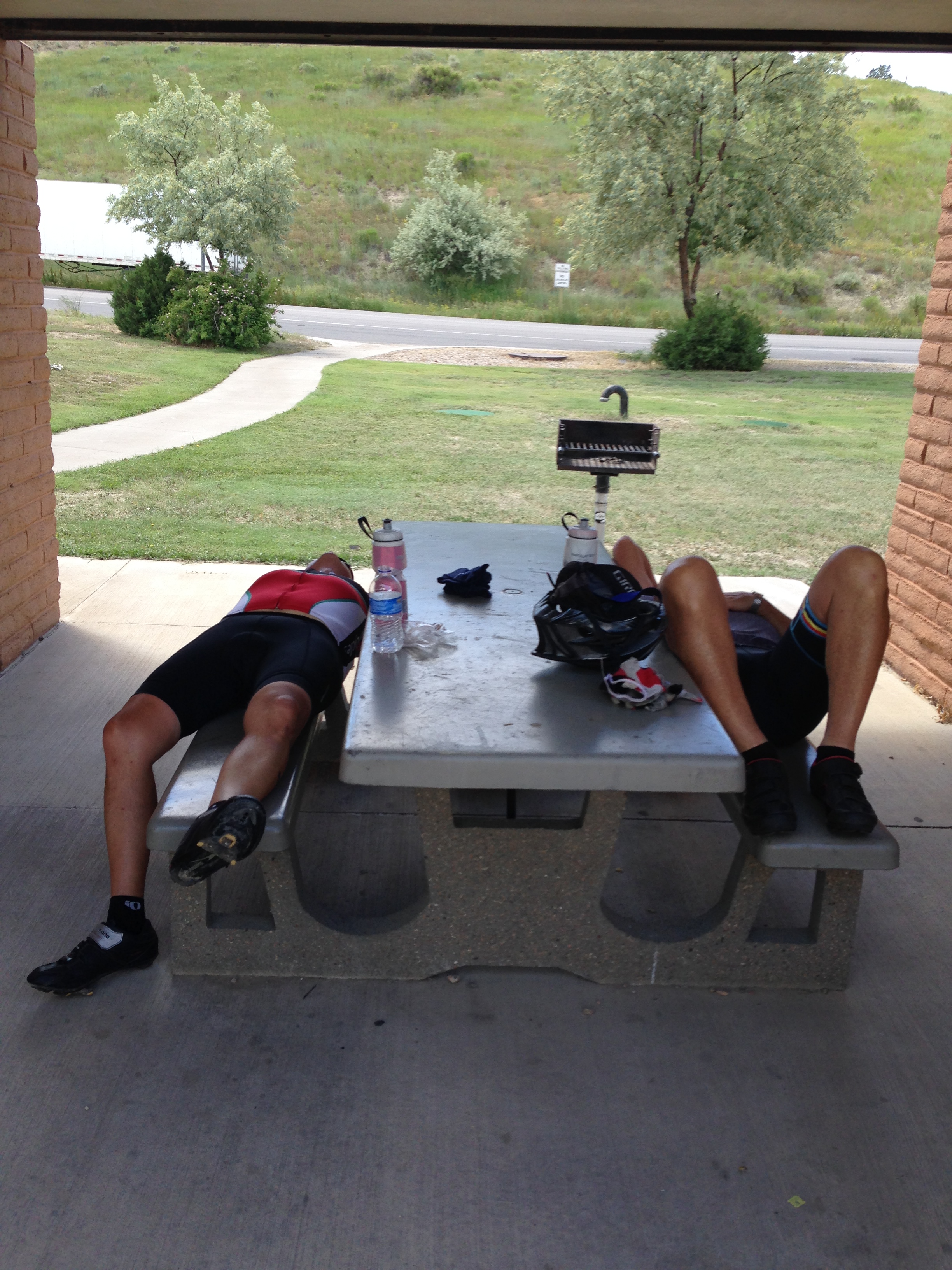Speaking of the Sundance Kid, that reminds me of another movie I just have to watch again: Butch Cassidy and the Sundance Kid. I keep humming “Raindrops keep falling on my head” while I ride. Yesterday, Alan got in one of his crazy moods at a rest stop, the only civilization between Gillette and Buffalo, Wyoming. He started chirping to Craig….”Yeh, in the Summer of 2014, you get to ride with the Christopher boys” while imitating his best gunslinger moves. 🙂 Alan’s favorite expression since entering Wyoming has been “Cowboy up” meaning to get on our bikes and ride. I have been thinking it is more like “Saddle up” complete with Saddle sores. I suggested to my touring buddies yesterday that if I lived in Wyoming or South Dakota I would enjoy having a horse to ride on the open range. After Craig and Alan busted my bubble with how much work it takes to keep up horses, I decided I might “rent a horse”. Meanwhile, at that same rest stop, the only services of any kind for 70 miles, Craig and I needed a power nap. Alan caught us in the act.