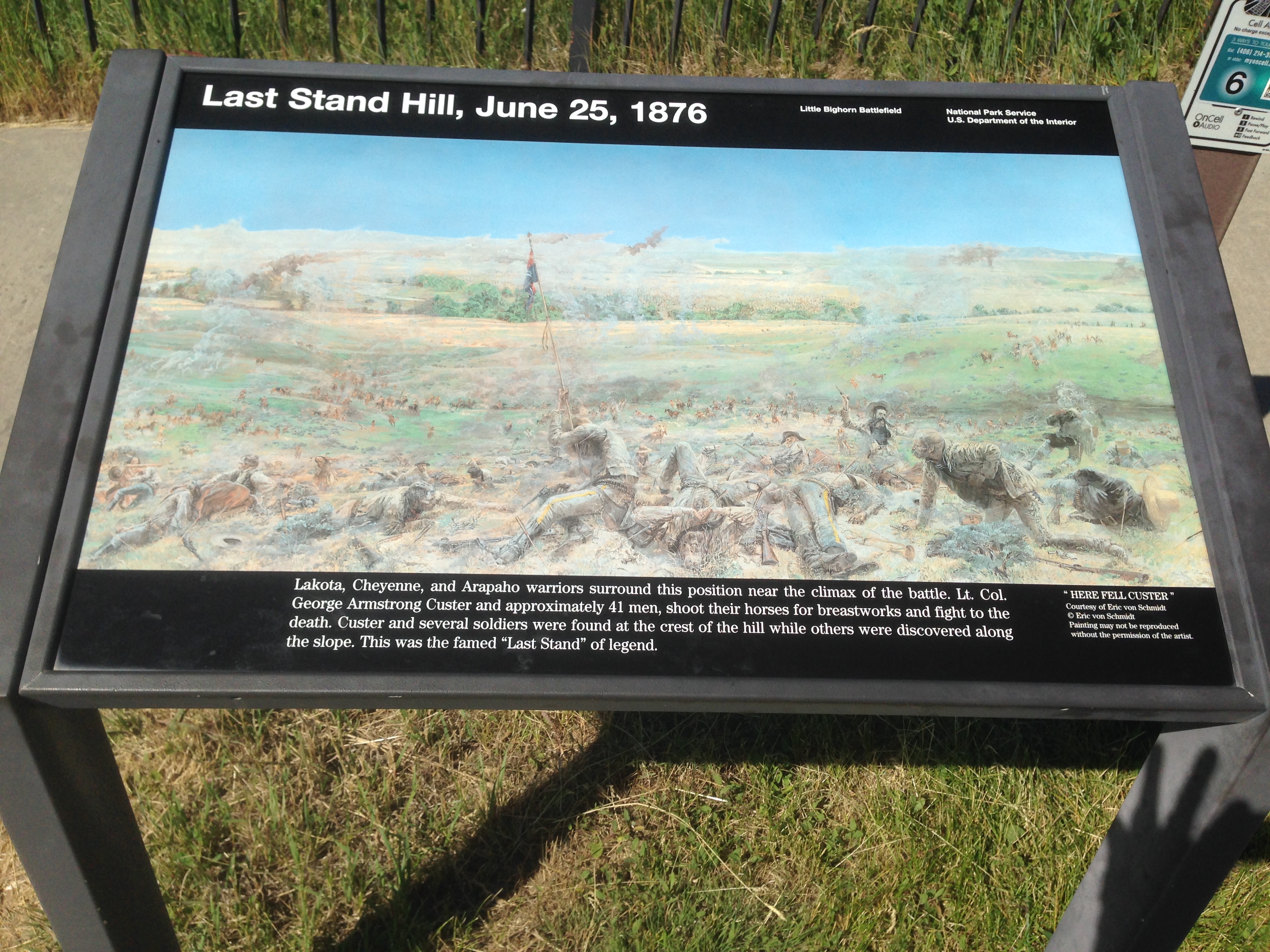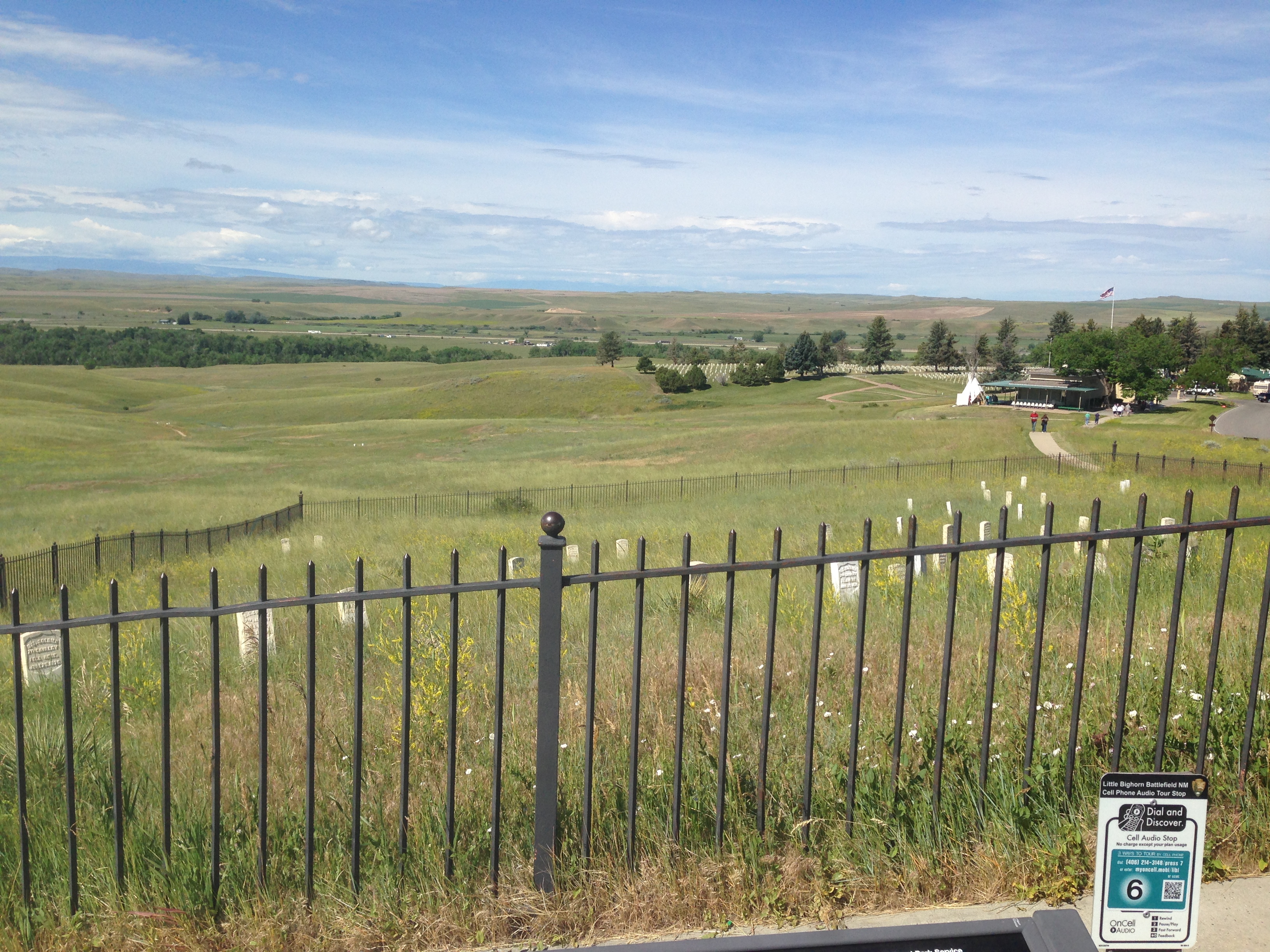 Sunday’s ride stared in Lodge Pass, Montana and ended in Billings with an exhilarating 2 mile curvy downhill after a steep climb up through a gulch. What goes up, thankfully must come down at least in bicycling. π We did 87 miles at a blistering pace averaging over 20 mph for major parts of the journey to have time to shower and change to join some rowdy fans in Billings for the US-Portugal World Cup game. Along the way we stopped for an hour and a half to tour Little Big Horn, the site of Custer’s Last Stand. It was a moving experience for me in many ways. The Park Ranger there did an excellent job retelling the background and the “why” leading up to June 25, 1876. The clash of cultures, the strategy, the mistakes and putting faces to the people who sacrificed their lives at Little Big Horn on the highest ground in the area was really riveting for me. The actual battle was over in 20 minutes or so with the Indian Nation winning the battle, but soon losing the war. This picture is taken at the top of the hill on the actual site where Custer had his men shoot their horses to serve as barricades and where most of them lost their lives. The monument in the background marks the gravesite for the enlisted men.