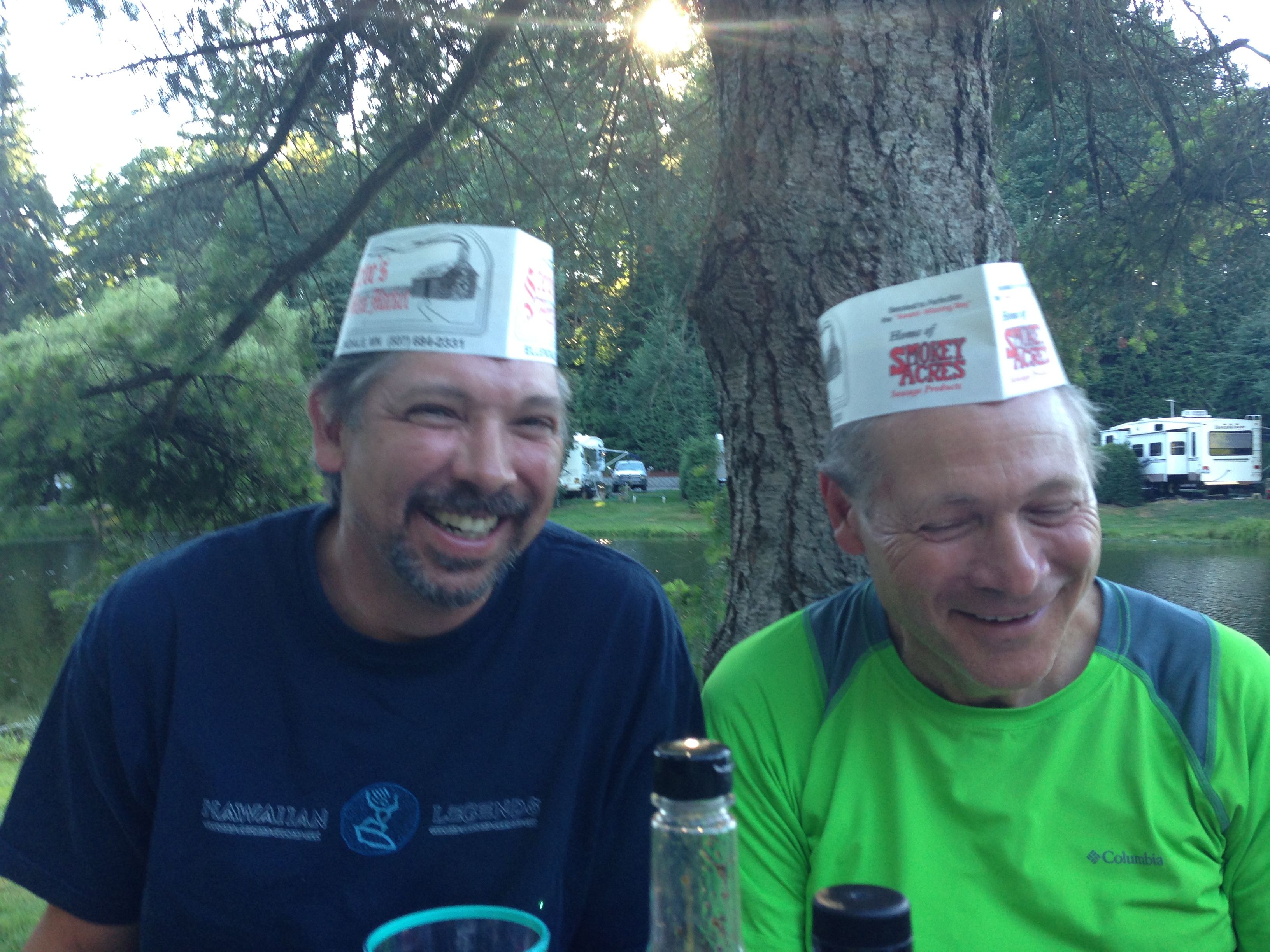 My brother Alan and I were goofing off for dinner wearing Steve’s hats that resembled hats my dad used to wear when he worked at Chico Dairy in Morgantown, WV.