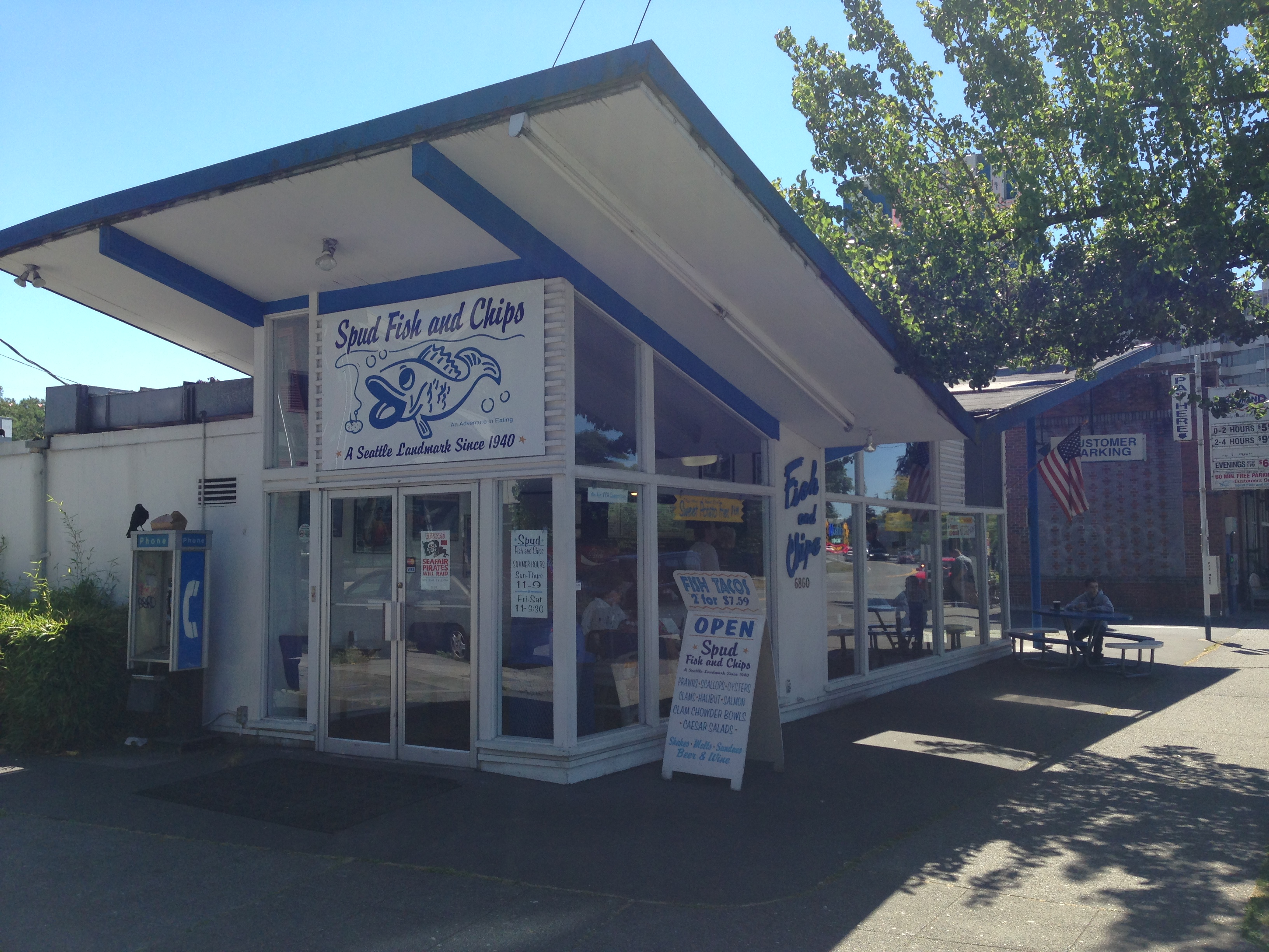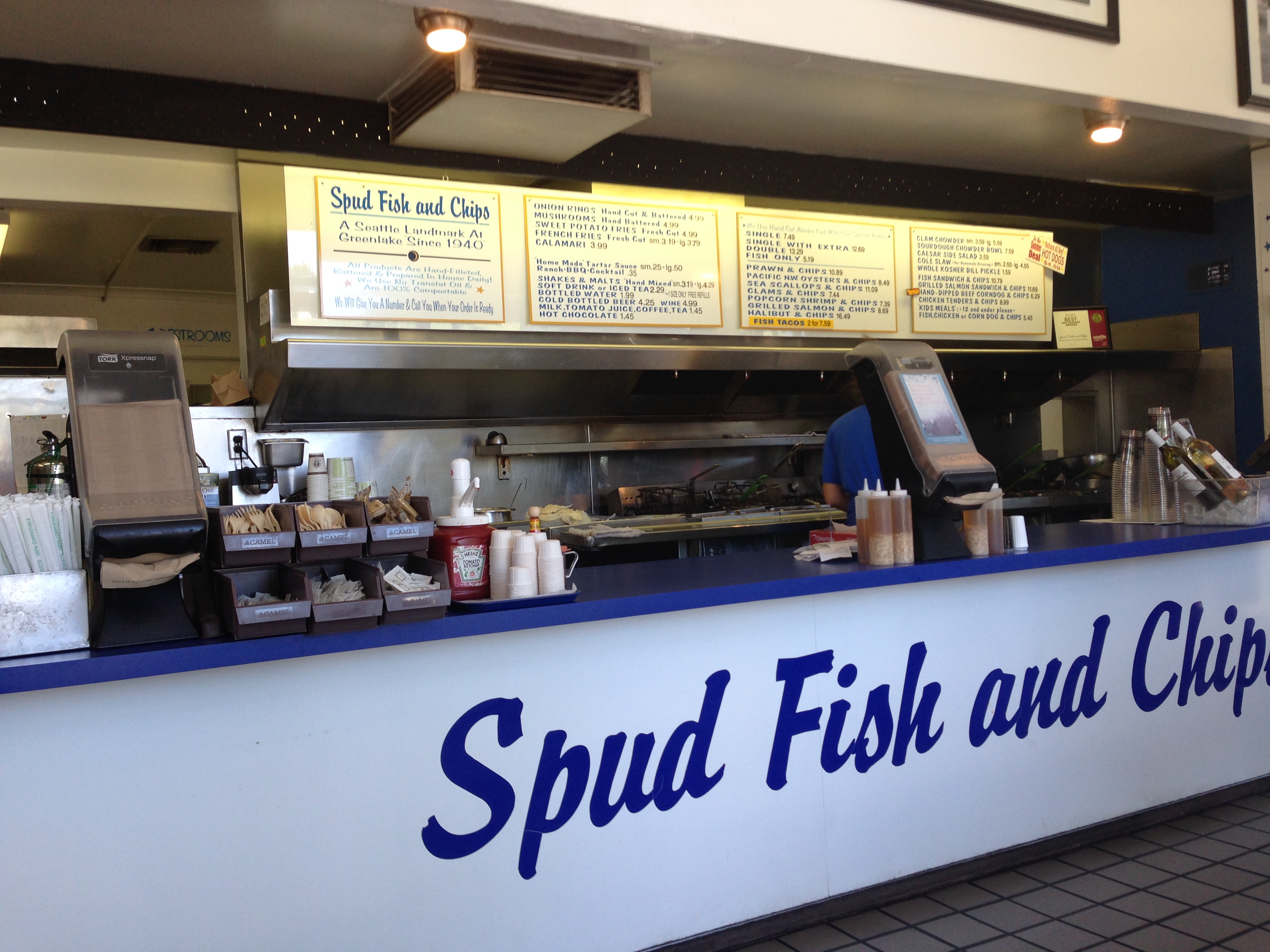 After dipping the tires in the ocean at Mukilteo Bay on Wednesday, Lisa and I spent four days in Seattle. Two days were spent getting our home away from home the past two months ready to sell and selling it: the travel trailer. We have a new happy owner and happy sellers! We celebrated the sale with lunch at Spud’s, a “Seattle Tradition since 1940”. While I was talking to my son Jon on the phone as lunch was served, Lisa struck up a conversation with the owner and shared our passion for small business owners. A little later, he brought us over a gift of two shirts as a momento!